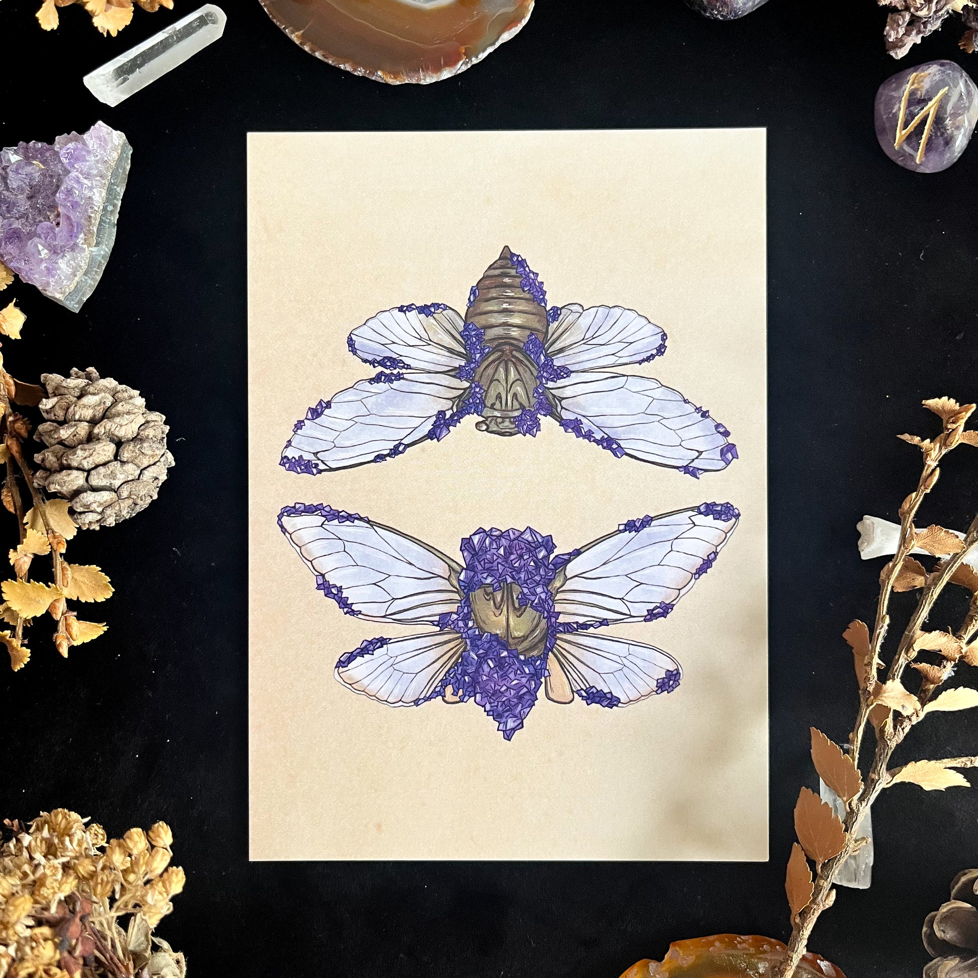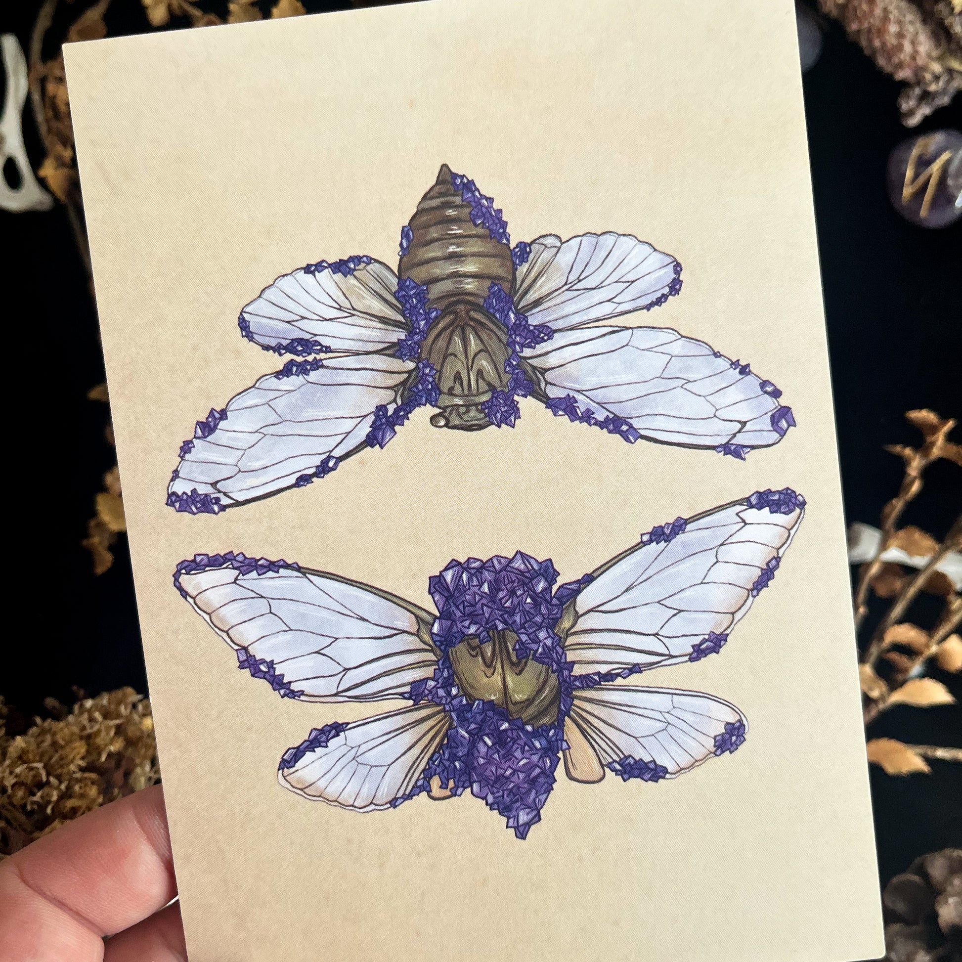 An A6 postcard on thick matte card featuring a drawing of two cicadas that are partially encased in amethyst, inspired by the work of artist and alchemist Tyler Thrasher!