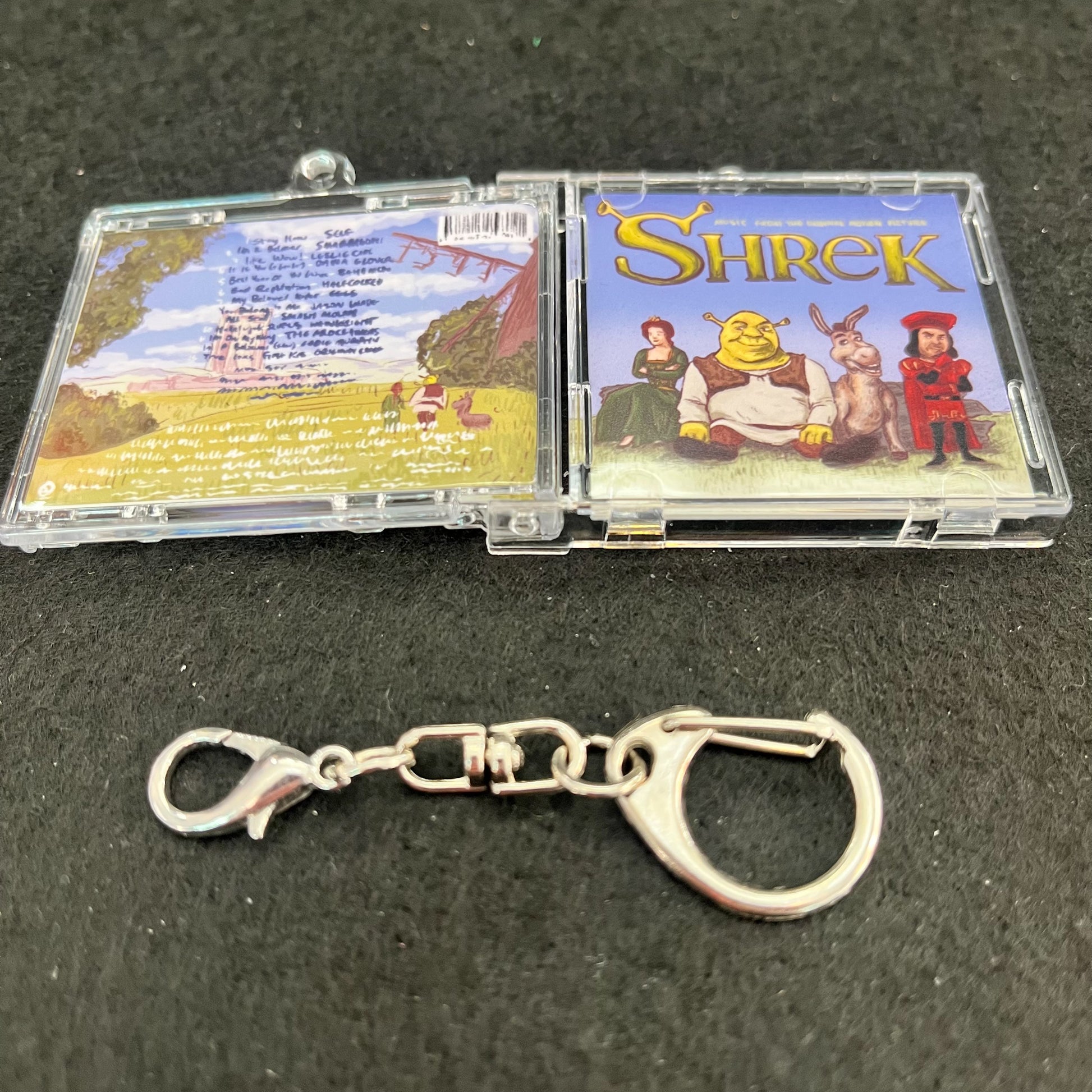 A 4.5x5cm keychain that's a tiny cd jewel case of the Shrek Soundtrack Album which opens when you take the keychain clip off and contains a tiny removable acrylic disc stickered with the album disc art.