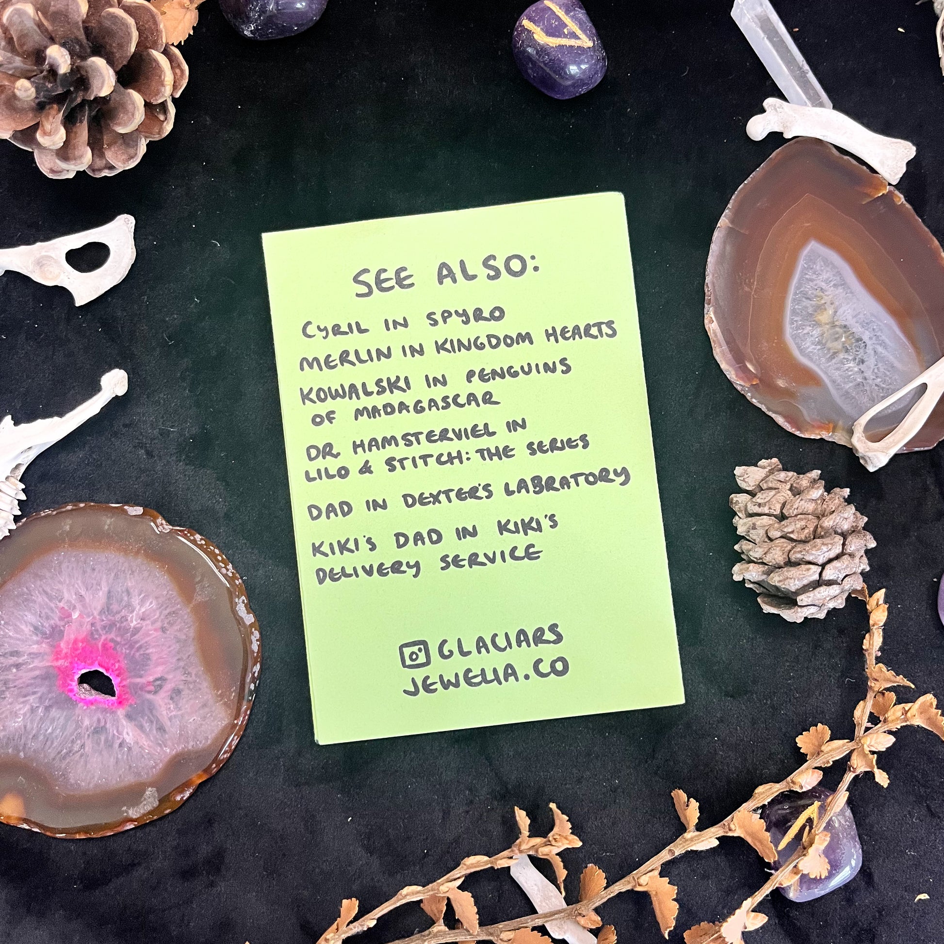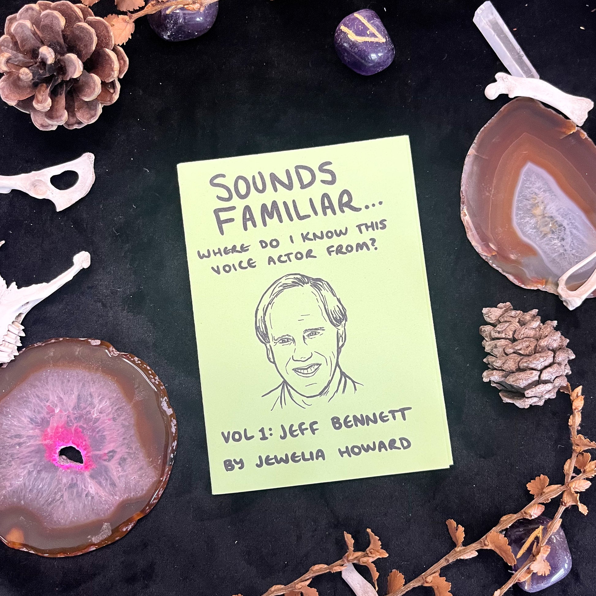 An a7 zine made of one folded sheet of coloured a4 paper, featuring a selection of different iconic animated roles by the voice actor Jeff Bennett.