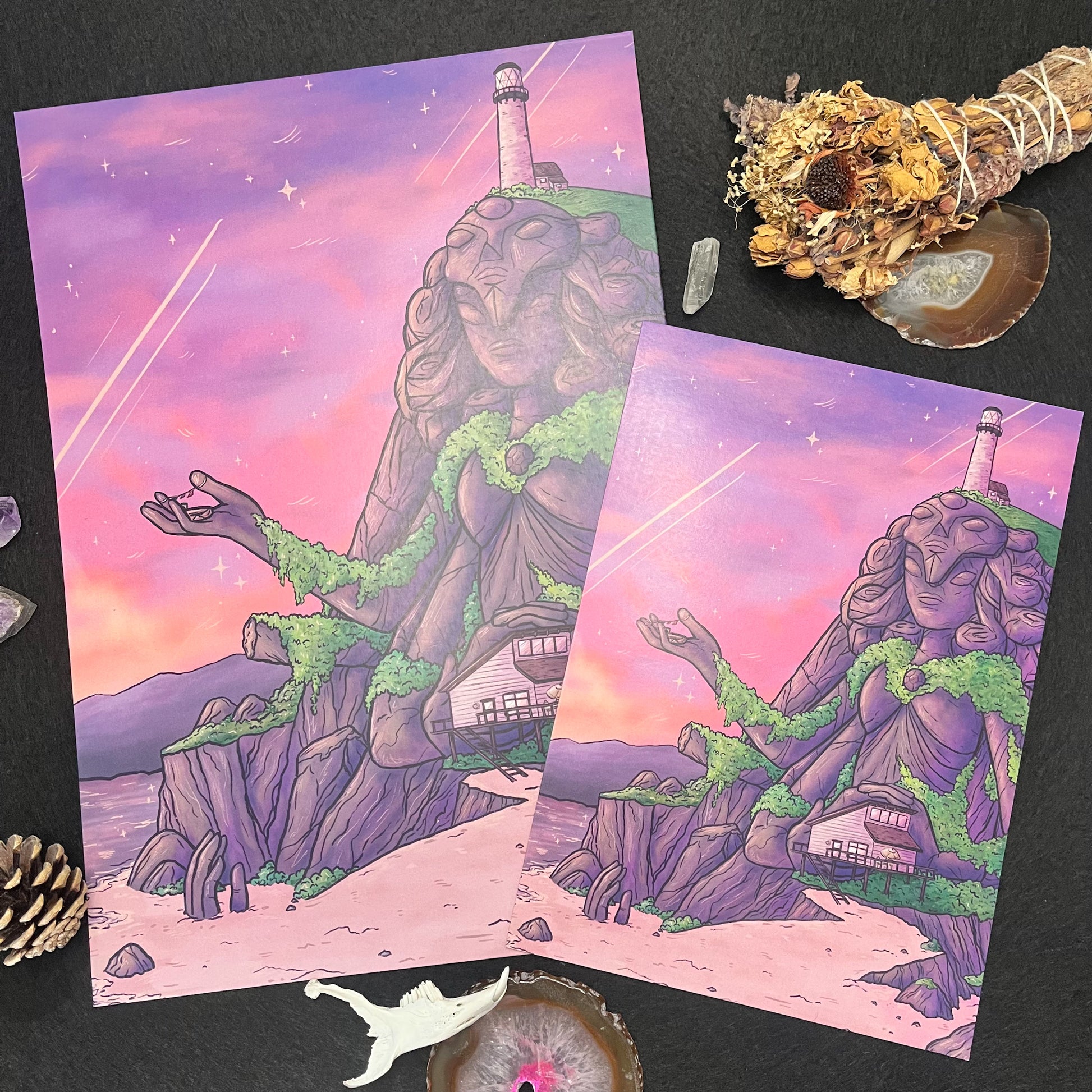 A print on 350gsm satin paper in your choice of A5 or A4 of a drawing of the house/statue ruins from Steven Universe.