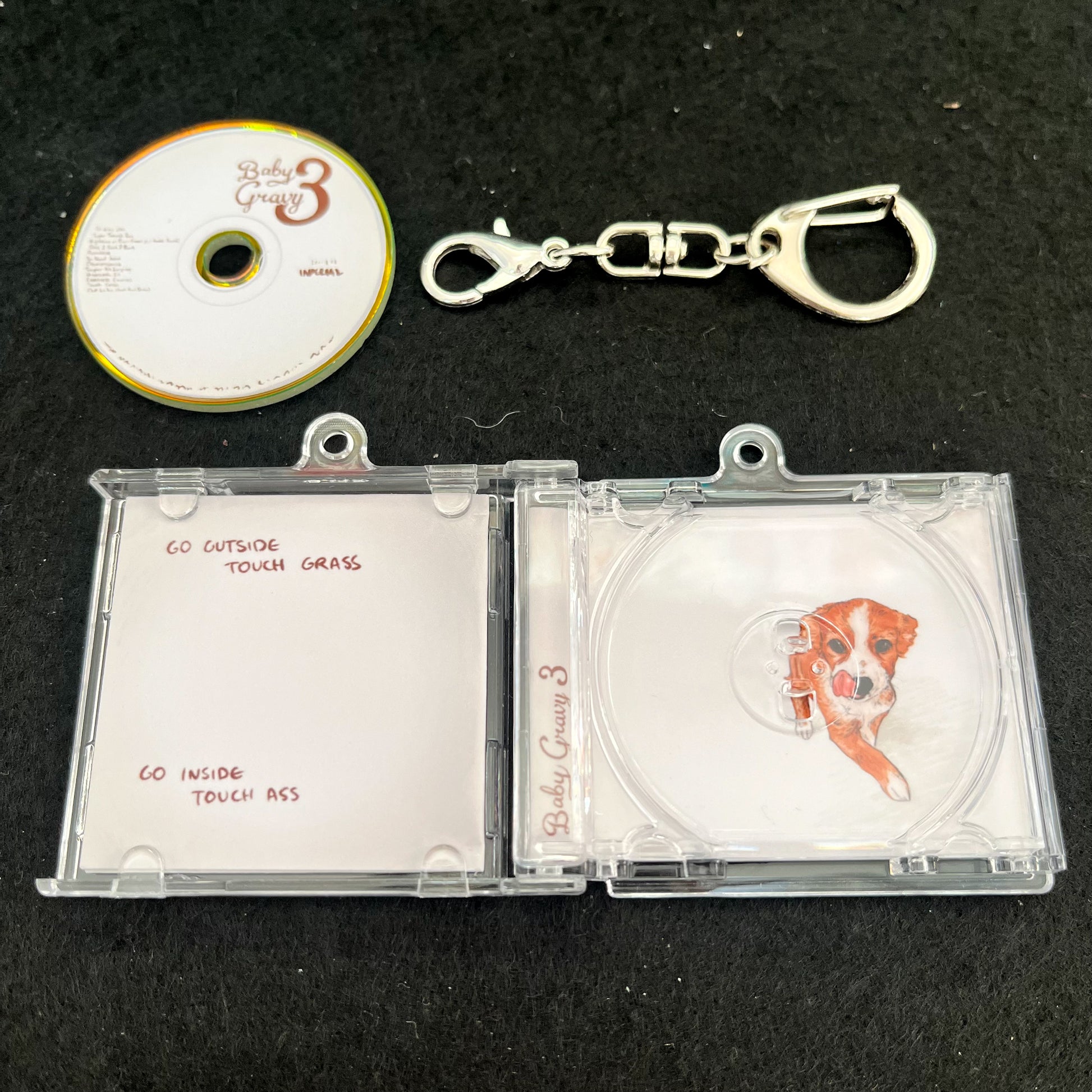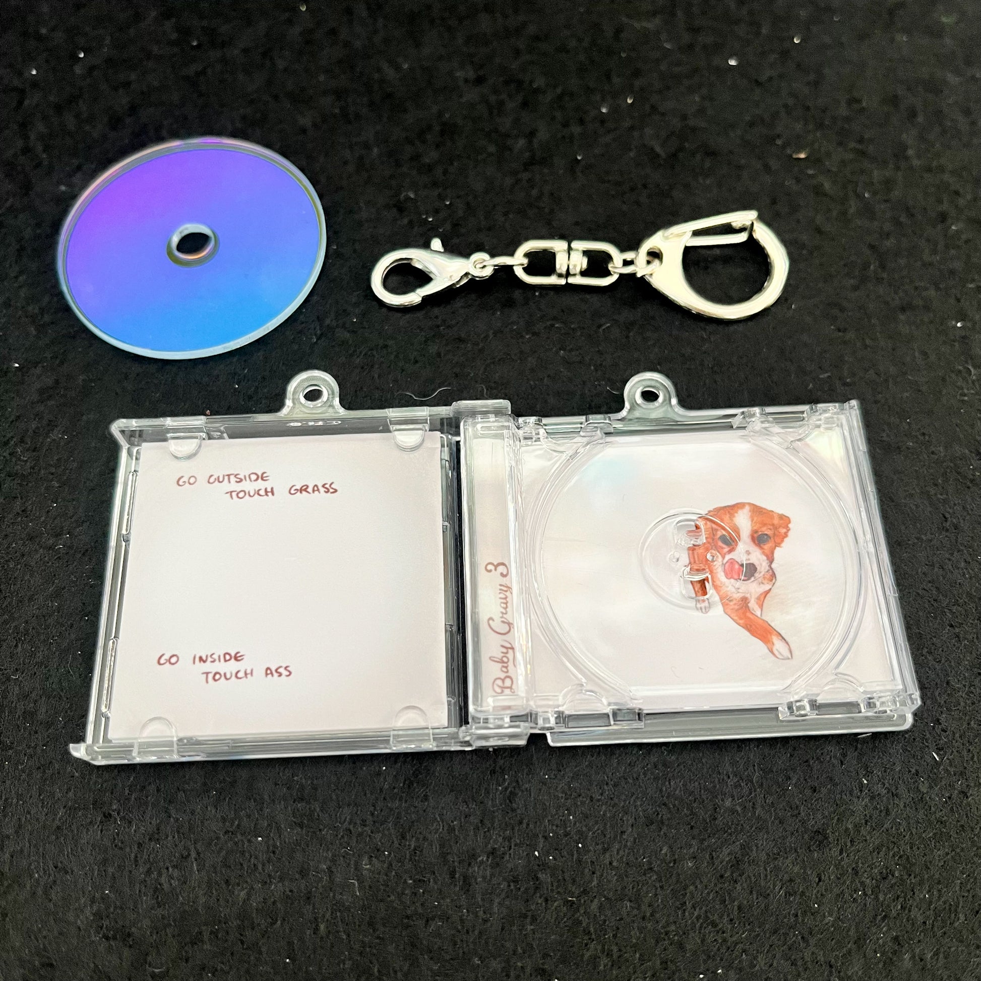 A 4.5x5cm keychain that's a tiny cd jewel case of the album Baby Gravy 3 by Baby Gravy (A collab project between Yung Gravy and bbno$) which opens when you take the keychain clip off and contains a tiny removable acrylic disc stickered with the album disc art.