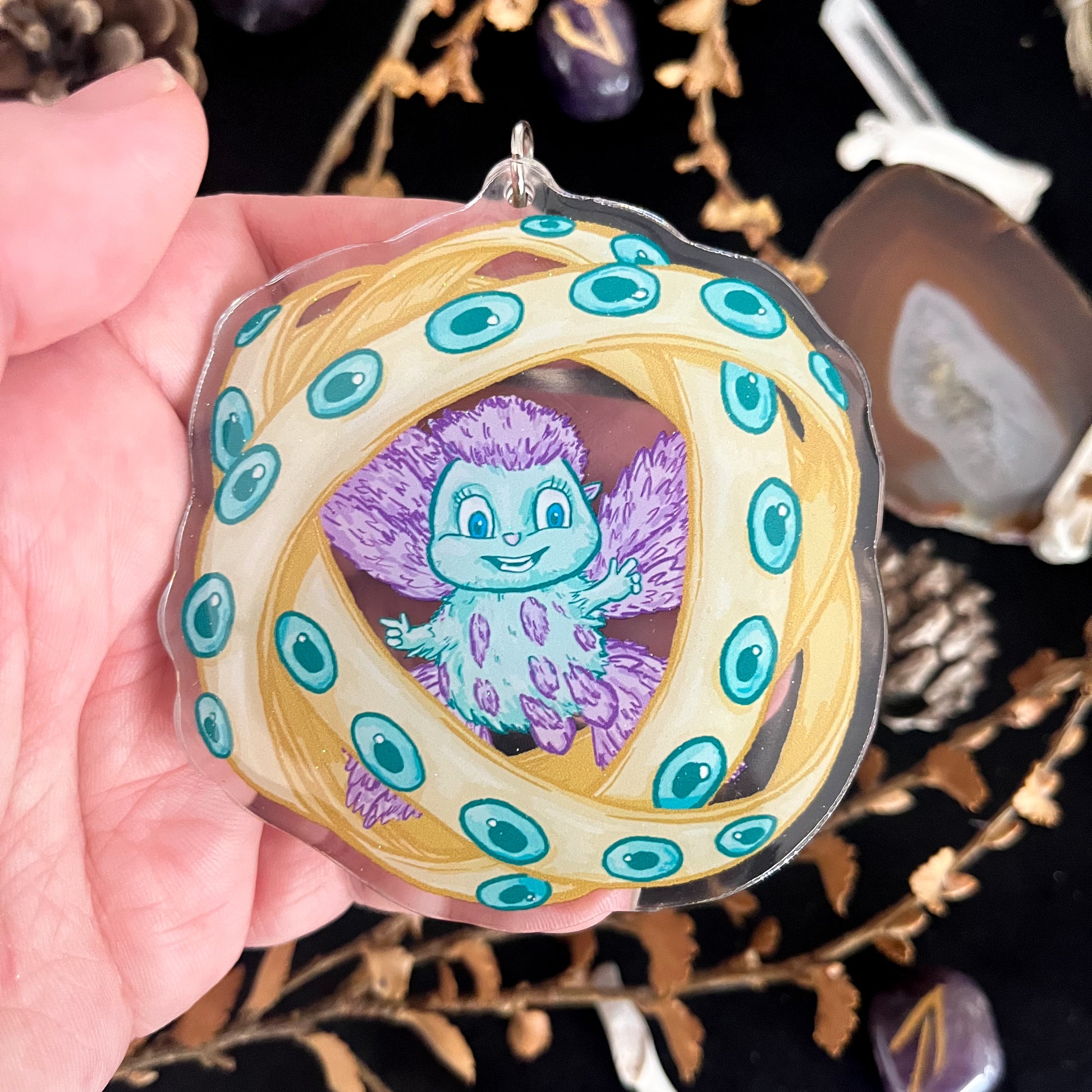 A 8x8cm acrylic charm attached to a keyring featuring a drawing of Bibble from the Barbie: Fairytopia series depicted as a biblically accurate angel that's coated on one side in glitter epoxy resin for extra durability and shine. Vibrant, sturdy and perfect for making your keys easy to find in the bottom of your bag!