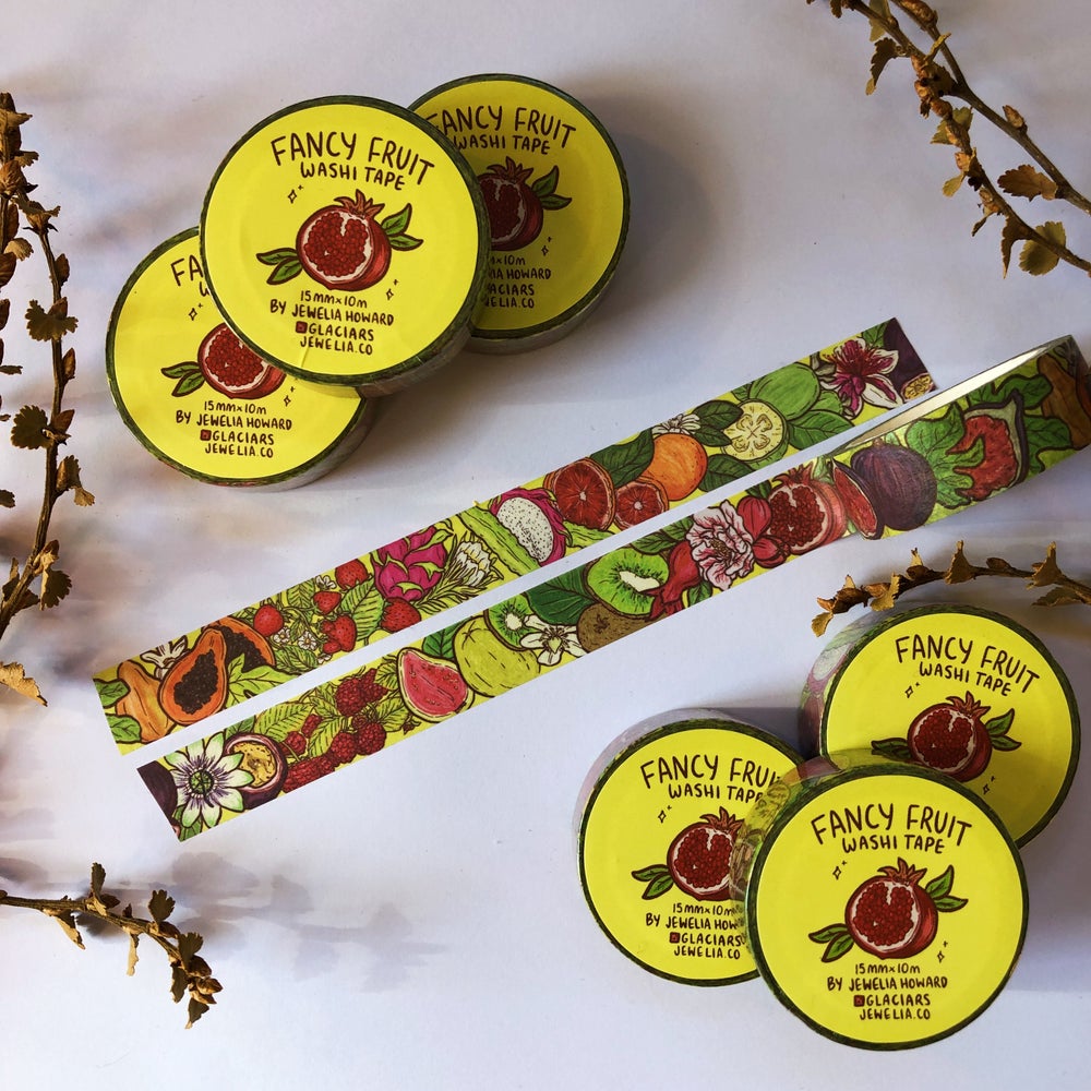 Washi tape designed by me featuring a collection of fruit drawings including raspberries, passionfruit, pomegranates, kiwifruit and many more on a vibrant green background. The tape is 15mm wide and 10m long and comes plastic wrapped with a sticker label on top.