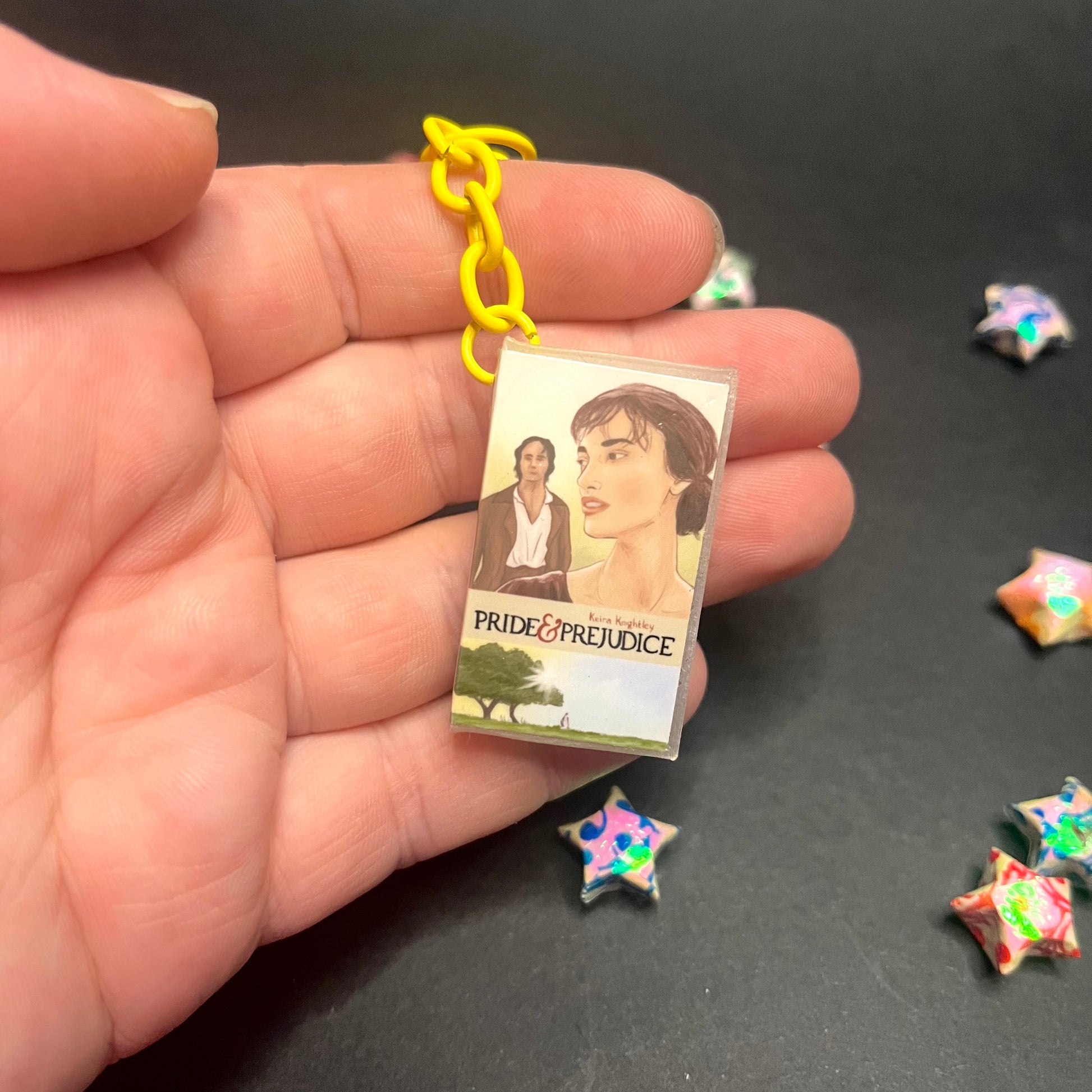 A 3.6cm x 0.8cm x 2.3cm transparent 3D printed PLA charm with a hand drawn VHS label of the film Pride & Prejudice (2005) stuck on and a yellow keychain attached so you can bring this excellent tiny piece of media with you wherever you go.