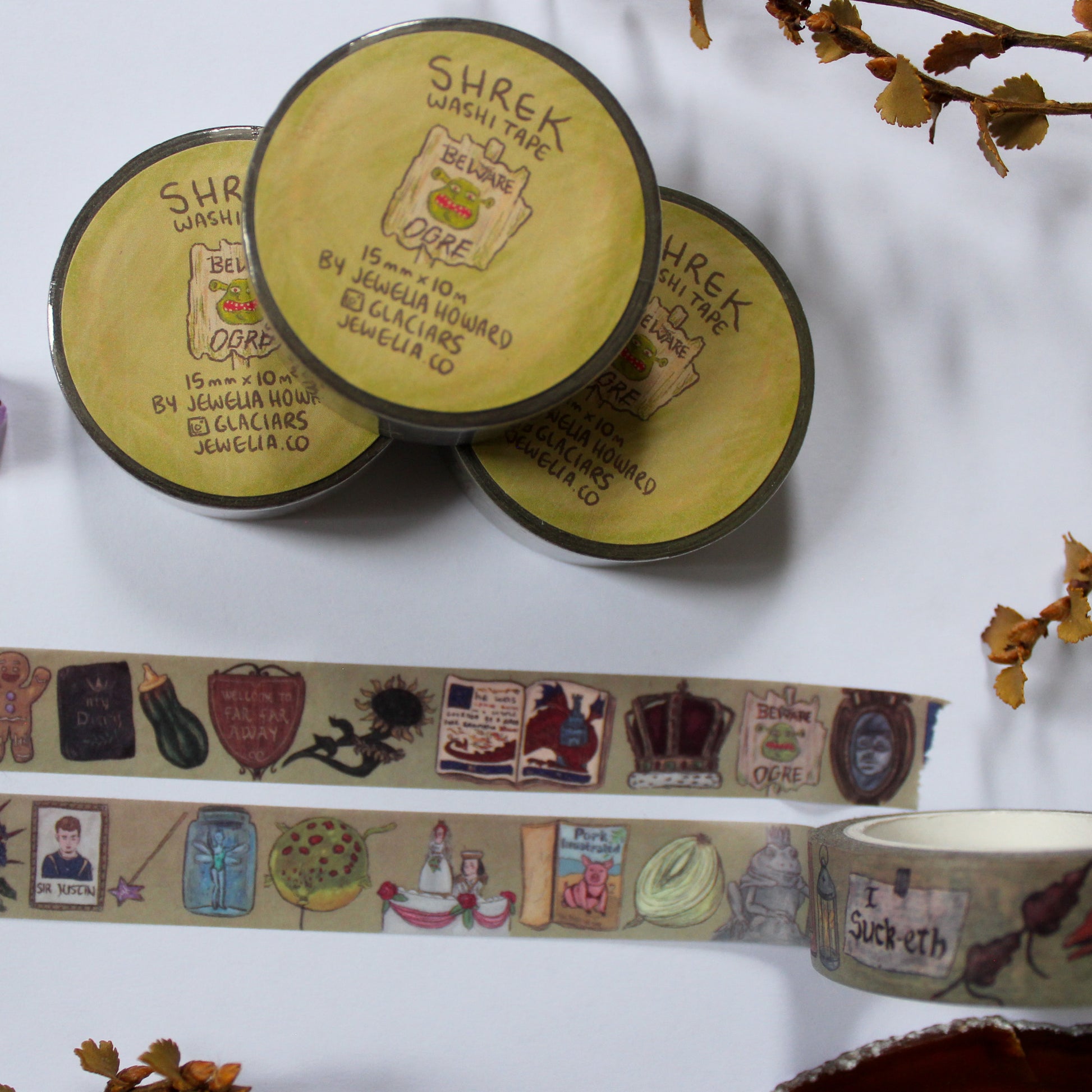 Washi tape designed by me featuring drawings of various items from the Shrek franchise. The tape is 15mm wide and 10m long and comes plastic wrapped with a sticker label on top. Washi tape is a decorative paper masking tape made of natural fibres and great for putting on things such as journals or for sticking pictures to your walls.
